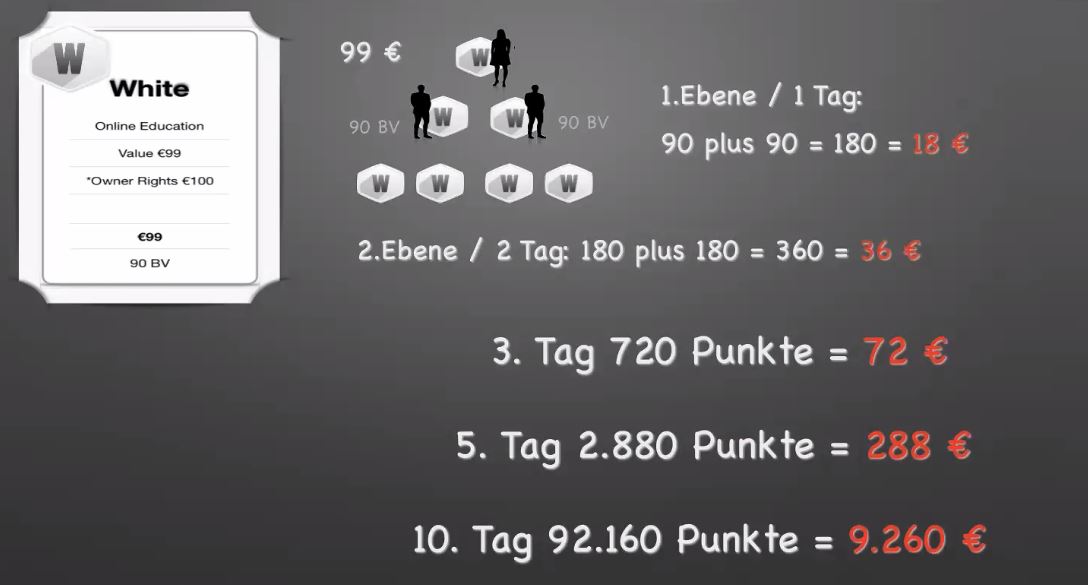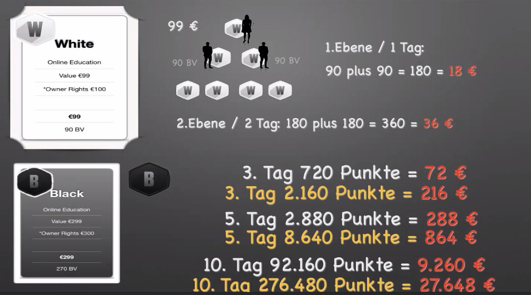 Man muss sich vorstellen,man hat mehr als 2 direkte Partner oder diese Partner haben das schwarze Paket um 299 Euro? Beim schwarzen Paket wären das sagenhafte 27.648 Euro